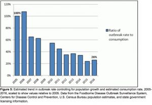 - Raw milk production continues to increase. “It is apparent from licensing statistics and consumer websites that unpasteurized milk is currently being produced on a larger scale than in past decades…. Compiling license and permit numbers for (just) nine states shows an increase over twelve years from 76 to 347 licensed unpasteurized milk dairies (+357%). Assuming that license and permit numbers are a reasonable proxy for consumption, and factoring in U.S. population growth (9.3% over the twelve year period), the ratio between outbreak rate and consumption rate shows a pronounced decline, with the 2016 outbreak-to-consumption ratio only 26% that of 2005.”